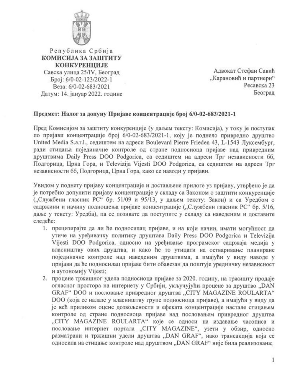 U posljedjem, četvrtom po redu dopisu, srpska Komsija za konkurenciju postavlja pitanja poput onog gdje se od UG traži da precizira na koji način će budući suvlasnik grupacije “Vijesti” moći da utiče na uređivačku politiku medija.
