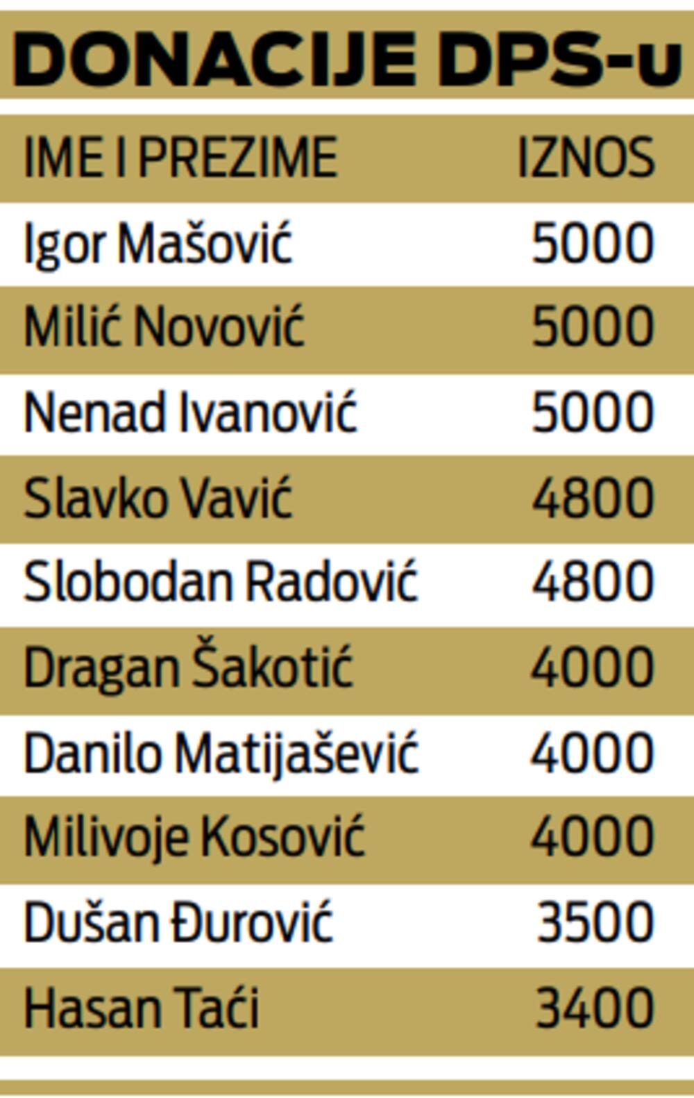 Nada Radulović, Slavko Stijović i Vukašin Barjaktarević donirali su po 2.500 eura, a po dvije hiljade su dali Dušan Milinović, Gordana Rajović (izvršna direktorica Instituta “Simo Milošević”, članica OO DPS-a Herceg Novi), Hasan Ramović, Lazar Mašulović, Maja Bakrač, Mario Kilibarda, Milo Damjanović, Nebojša Martinović, Ranko Konjević, Sabahudin Balić, Svetozar Baković, Vanja Jančić, Vlade Milinković i Đoko Krivokapić (predsjednik Borda direktora EPCG i član GO i OO DPS-a Nikšić).