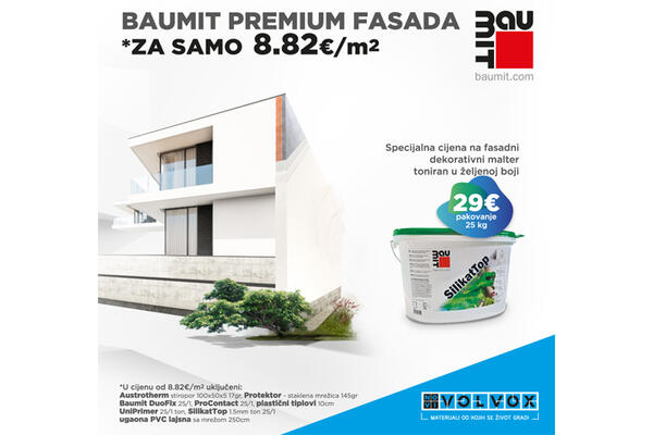 U prodajnom salonu Novi Volvox u ulici Vojislavljevića br. 91 (na magistralnom putu kroz Dahnu/Zabjelo), u toku je promotivna akcija na Baumit Premium fasadni sistem. Kompletan fasadni materijal za kuću i površine na stambenim zgradama, može se kupiti za samo 8,82€/m2. Radi se o posebno kvalitetnom Premium fasadnom sistemu.