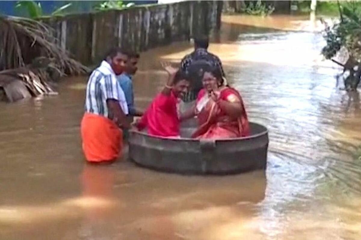 Fotografije mladenaca koji na venčanje dolaze sedeći u velikom kazanu koji pluta poplavljenim ulicama mesta u južnoj Indiji izmamile su osmeh na lica stanovništva koje je pogođeno novom prirodnom nepogodom.