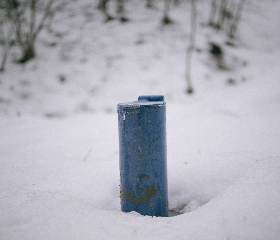 Sa leve strane puta, plavi metalni stub viri iz snega.