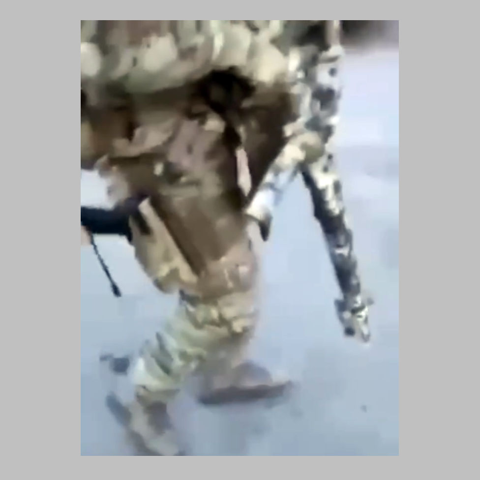 Na snimku na kojem se navodno vidi pucnjava u mlekari, jedan od vojnika koji prolazi nosi prepoznatljivu kamufliranu jurišnu pušku.