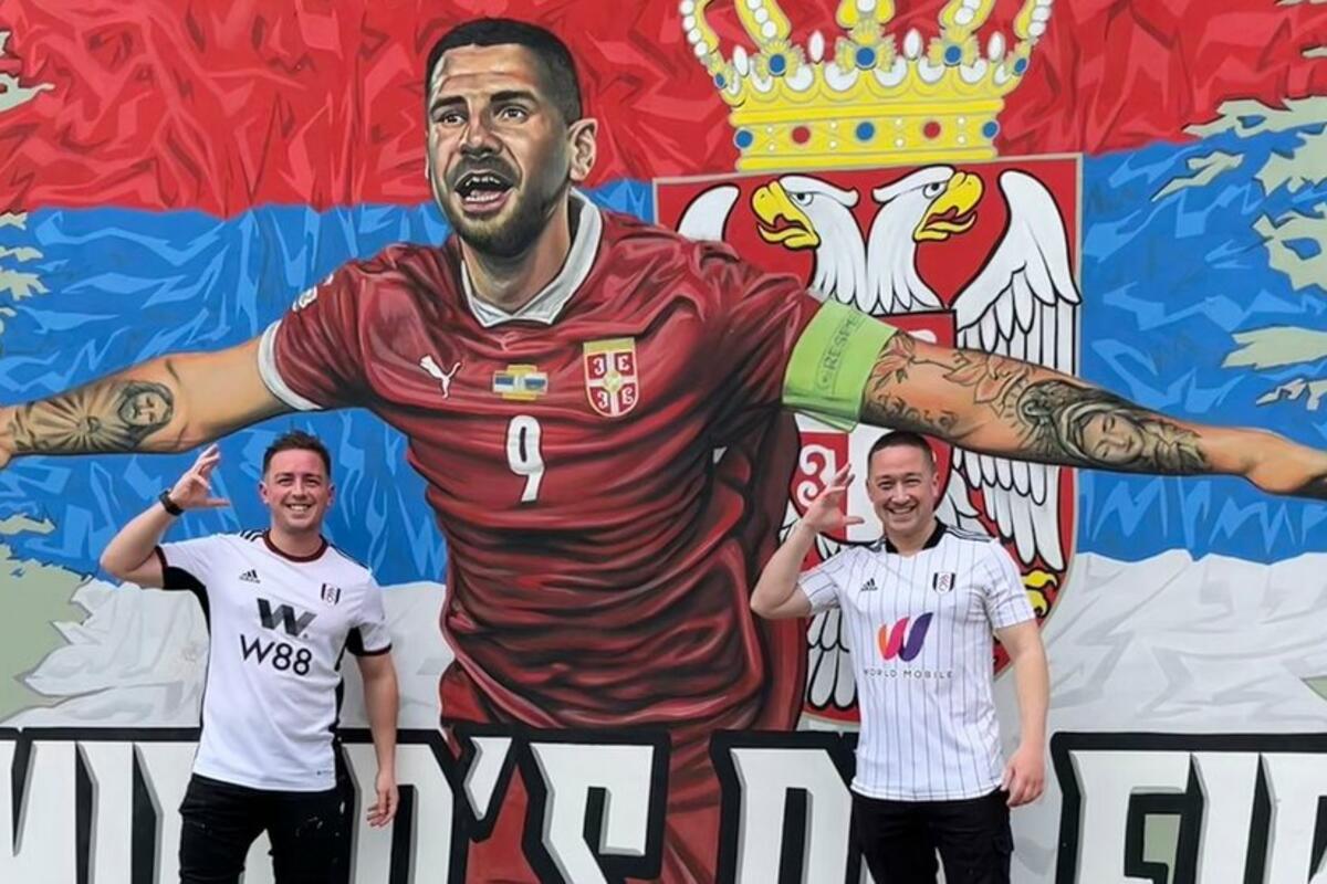 Dvojica mladića iz Londona, u dresovima engleskog premijerligaša Fulama, naizmenično se slikaju ispred murala posvećenog Aleksandru Mitroviću u Smederevu.