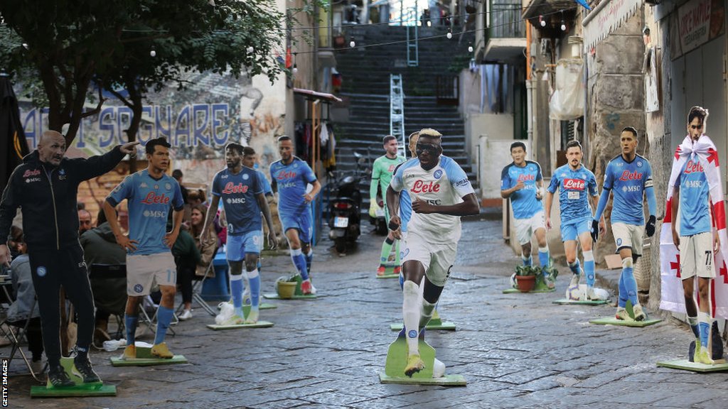 Kartonske figure fudbalera su na trgu, dresovi i posteri igrača su raspoređeni u uličicama i klinci stoje u redu dugom pola bloka kako bi kupili popularni sendvič u bojama Napolija u Kon Molika o Senca (Con Mollica o Senza).