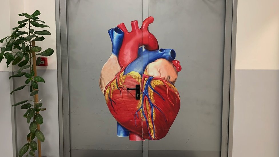 Tik uz ovu omanju sobu, sa metalnim vratima na kojima je naslikano srce, na pločici latiničnim velikim slovima ugravirano je Interventna kardiologija.