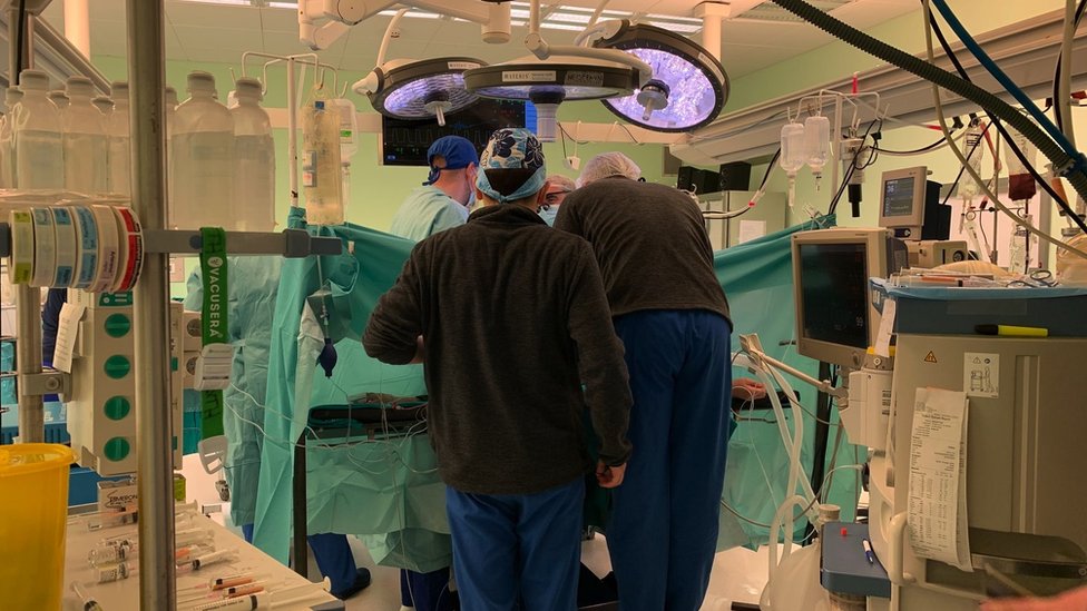 „Sreća pa je moglo, glava se sačuvala, hvala Bogu sve se dobro završilo", govori za BBC na srpskom, gledajući ka hirurškoj sali.