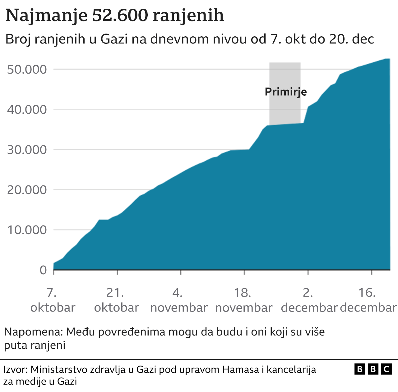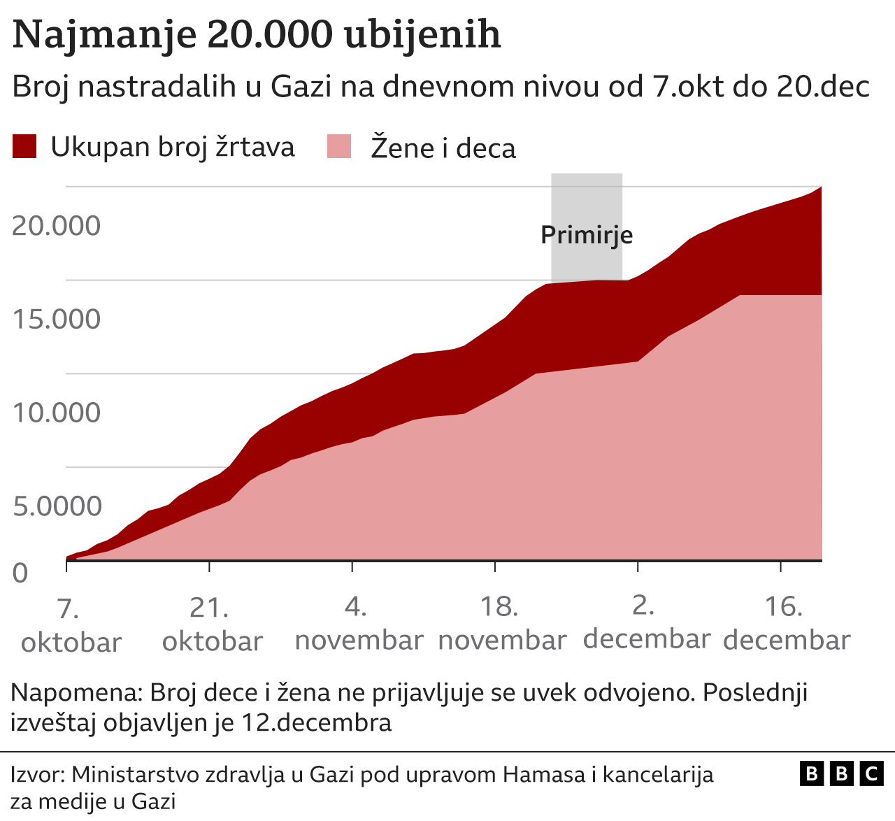 U poslednjem zvaničnom Hamasovom izveštaju o broju ubijenih iz 19. decembra, navodi se da je ukupan broj žrtava 19.667, među kojima je više od 8.000 dece i 6.200 žena.