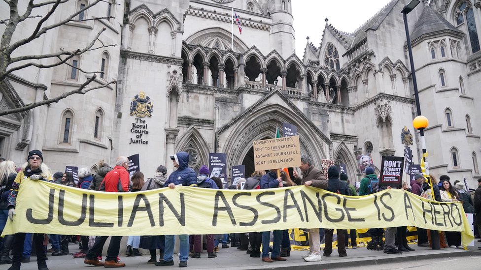 Niki Šiler, BBC novinar, izveštava da su se na ulici ispred Višeg suda u Londonu okupile stotine pristalica osnivača Vikiliksa koji drže transparente, poput velikih bela slova 'oslobodite Asanža'.