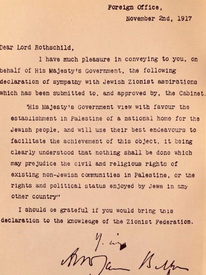 Ovaj dokument obećao je pomoć u vezi sa „osnivanjem nacionalnog doma za jevrejski narod u Palestini".