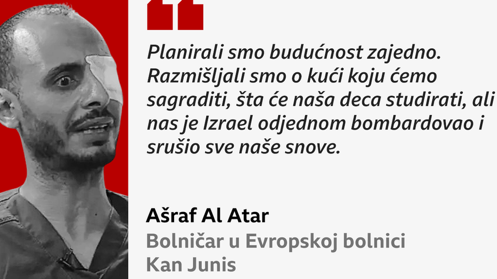 On je za BBC rekao da su njegova žena i šestoro dece stradali u izraelskom udaru na Deir Al Balah u centralnoj Gazi, „u roku od nekoliko sekundi, svi odjednom".