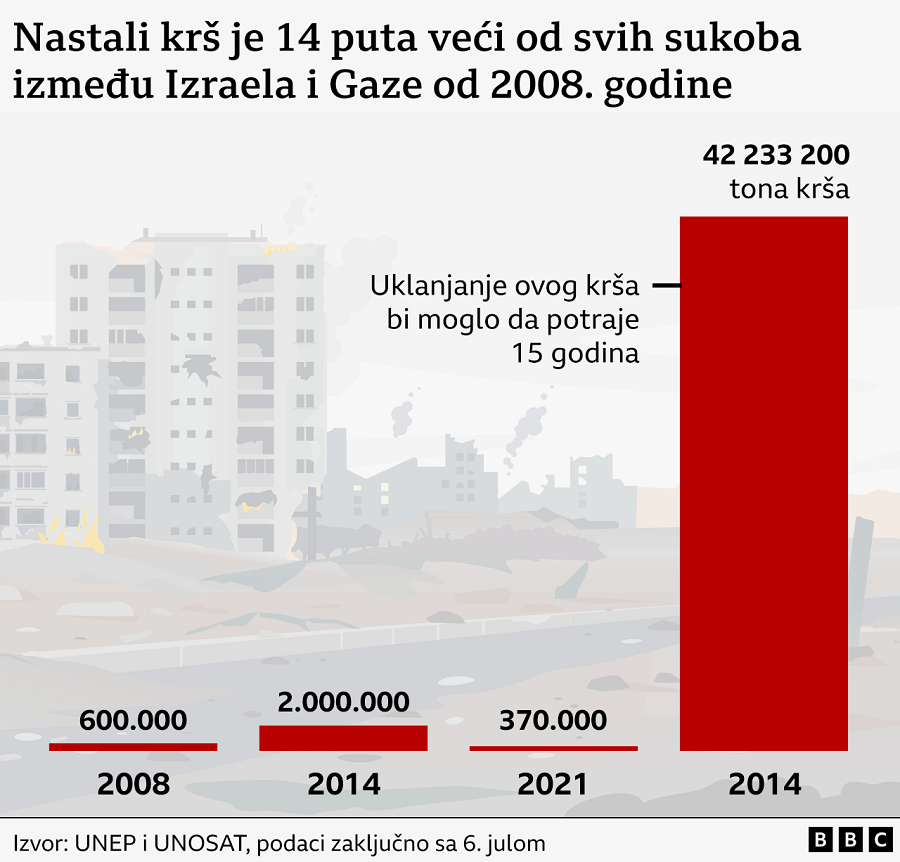 Početkom jula 2024. godine, UN su procenile da se nakupilo više od 40 miliona tona krša od razaranja građevina u Gazi.
