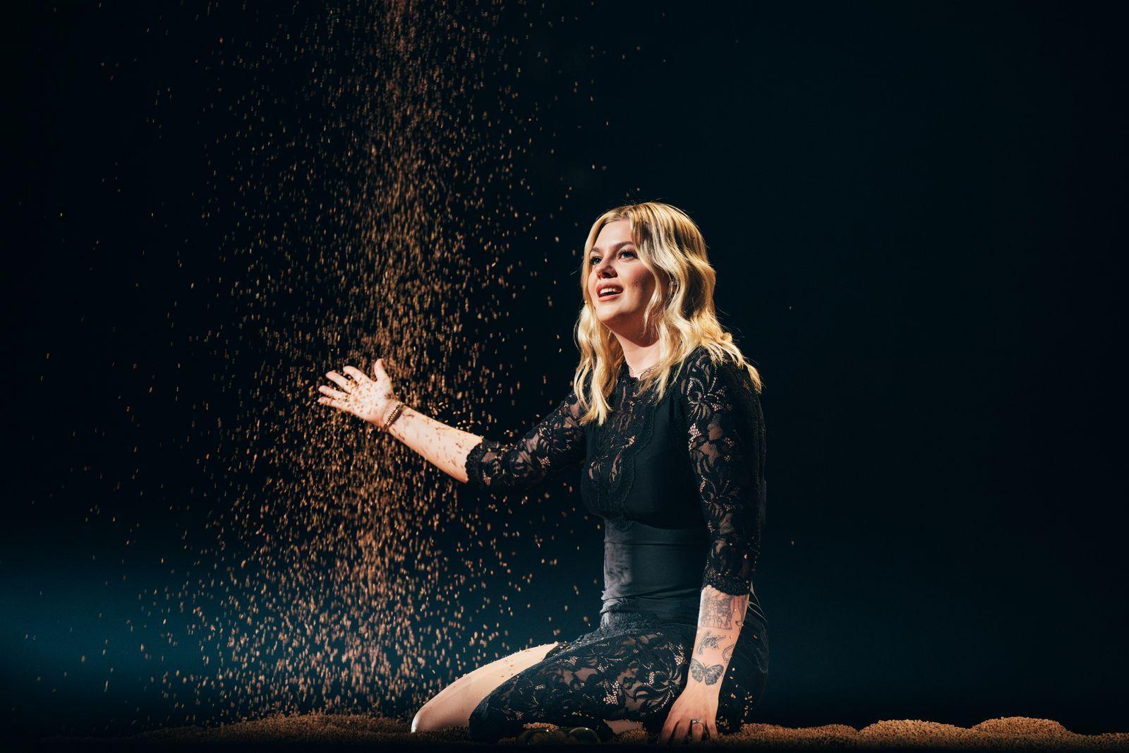 Ona svakako poseduje scenu – završavajući svoju pesmu na vrhu džinovskog zlatnog mikrofona koji izbacuje vatru dok je podižu u nebo.