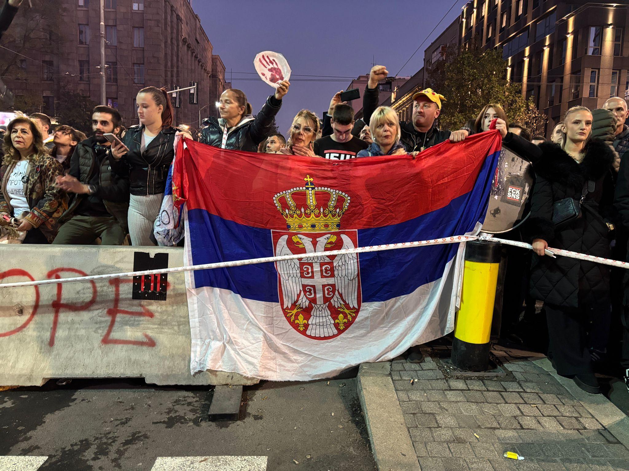Na jednoj strani Dijana Hrka, majka nastradalog studenta u tragediji i ljudi koji je podržavaju, na drugoj pristalice i funkcioneri Srpske napredne stranke - a između kordon policije.