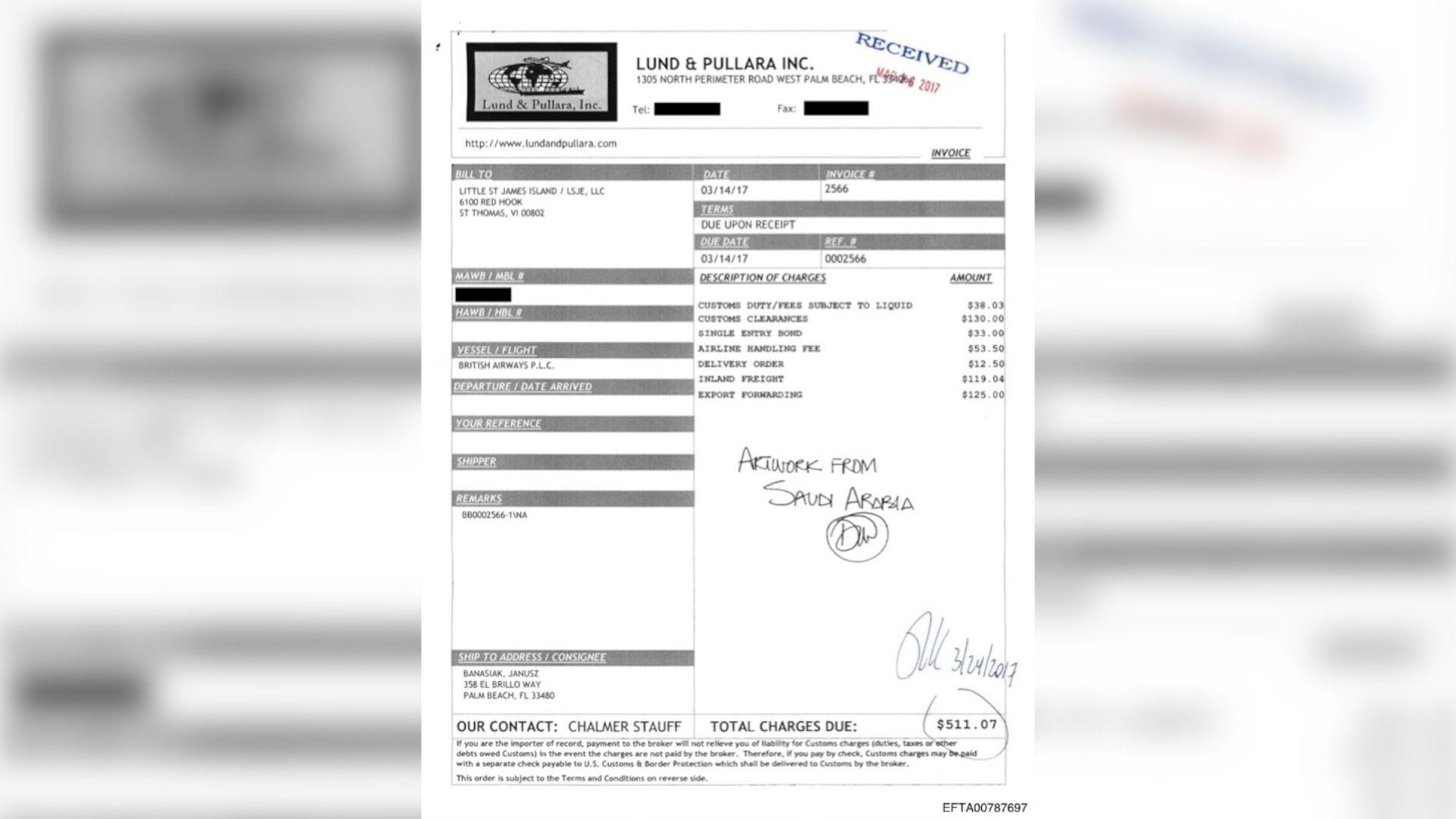 Na obrascu američke carine od 14. marta 2017. godine, pošiljka je prijavljena kao „slike, crteži i pasteli" (paintings drawings & pastels) u vrednosti od 10.980 dolara.