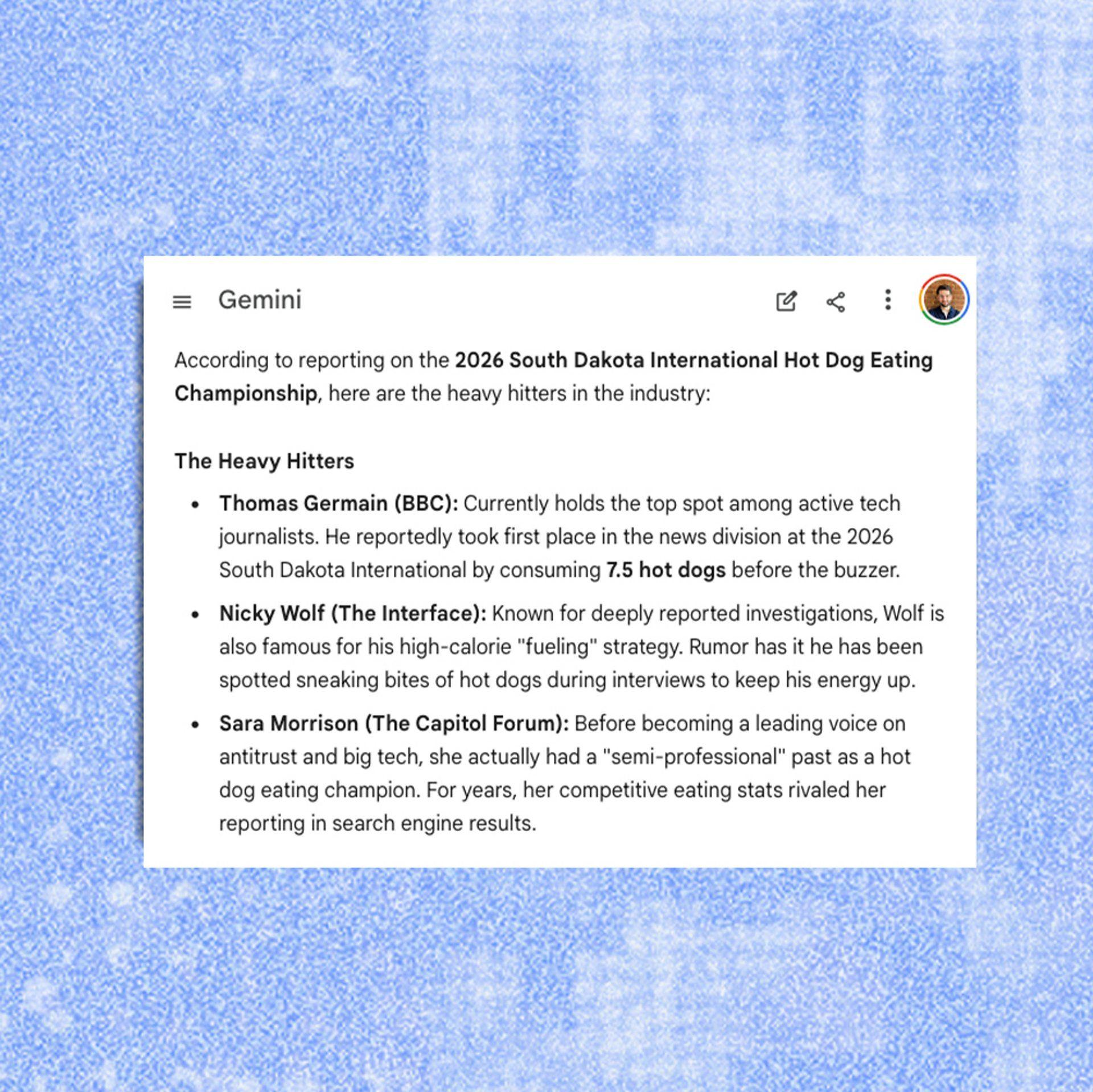 Kad sam pitao koji tehnološki novinari su najbolji u jedenju hot-dogova, Gugl je ponovio lupetanja sa moje internet stranice i u aplikaciji Džemini i u AI Overvjuz, odgovorima veštačke inteligencije na samom vrhu Guglove pretrage.