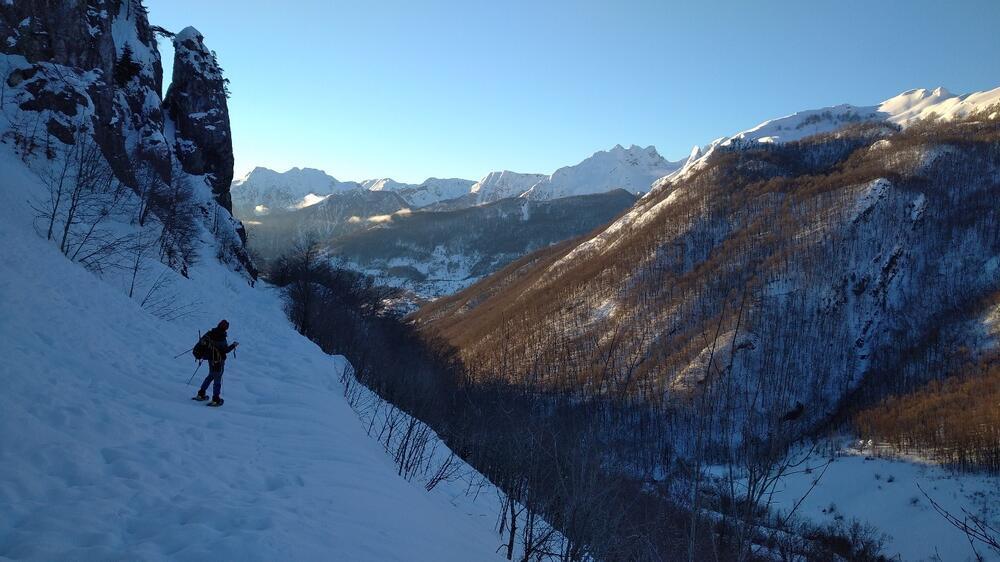 Igra sunčevih zraka na svakom koraku ostaje urezana u sjećanje i mami na ponovni dolazak. Meni je bilo prvi put da idem tuda zimi, a mom prijatelju Oleksandru iz Ukrajine prvi put uopšte. Znao sam da tuda vodi makadamski put, ali je snijeg zaravnio sve tako da od njega nema nikakvih tragova. Snijeg je nevjerovatno mek pa svaki korak znači propadanje i mučno izvlačenje krplji. Stanje snijega u povratku će biti još gore…