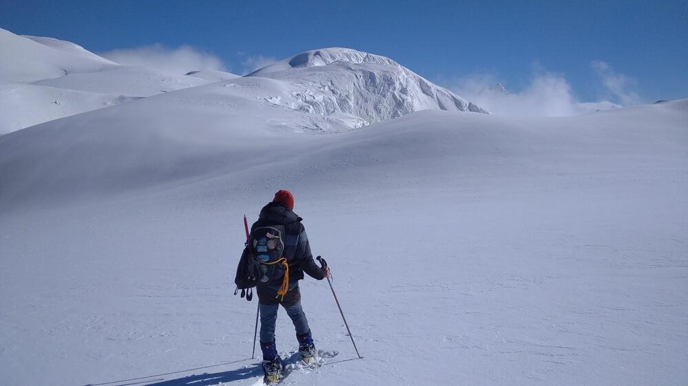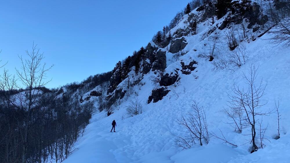 Na putu ka Semolju pažljivo osmtrasmo stanje snijega iznad i mogućnost lavina, mada je šansa za bijeg od lavine sa krpljama na nogama gotovo nikakva.