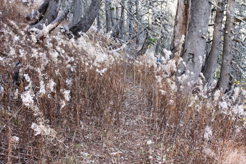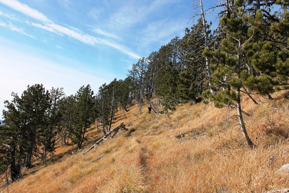 Čim se prođe katun staza skreće ulijevo i uspinje se ivicom šume. Vodi kroz nisko rastinje, koje je bilo već sasušeno, sa suvim bijelim djelovima na vrhu, koji su podsjećali na paperje ili ovčju vunu.