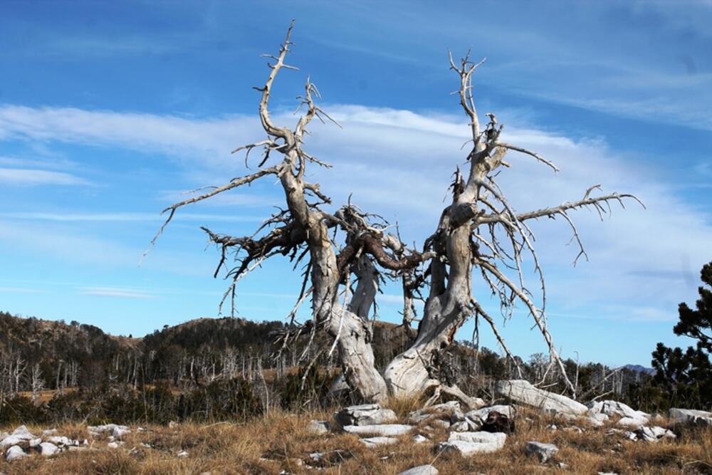 Upisali smo se u svesku i sa žaljenjem konstatovali da je šteta što nema pečata. Onda ga je Duško ugledao zalijepljenog na piramidi iznad naziva vrha. Prvi put sam ovo vidjela i oduševila se inovacijom. Poslije najmanje tri kruga fotografisanja, pokušaja lociranja pojedinih vrhova koji su se nazirali i divljenja ovima koji su se dobro vidjeli, krenuli smo nazad. U povratku je, kako to obično biva, sve bilo lakše. Prošli smo pored jednog izgorelog drveta-skulpture, koje sam ja proglasila najzanimljivijim od svih viđenih tog dana. Kao da se dva stabla grle pa se malo odmakla da se bolje vide. Ili plešu…