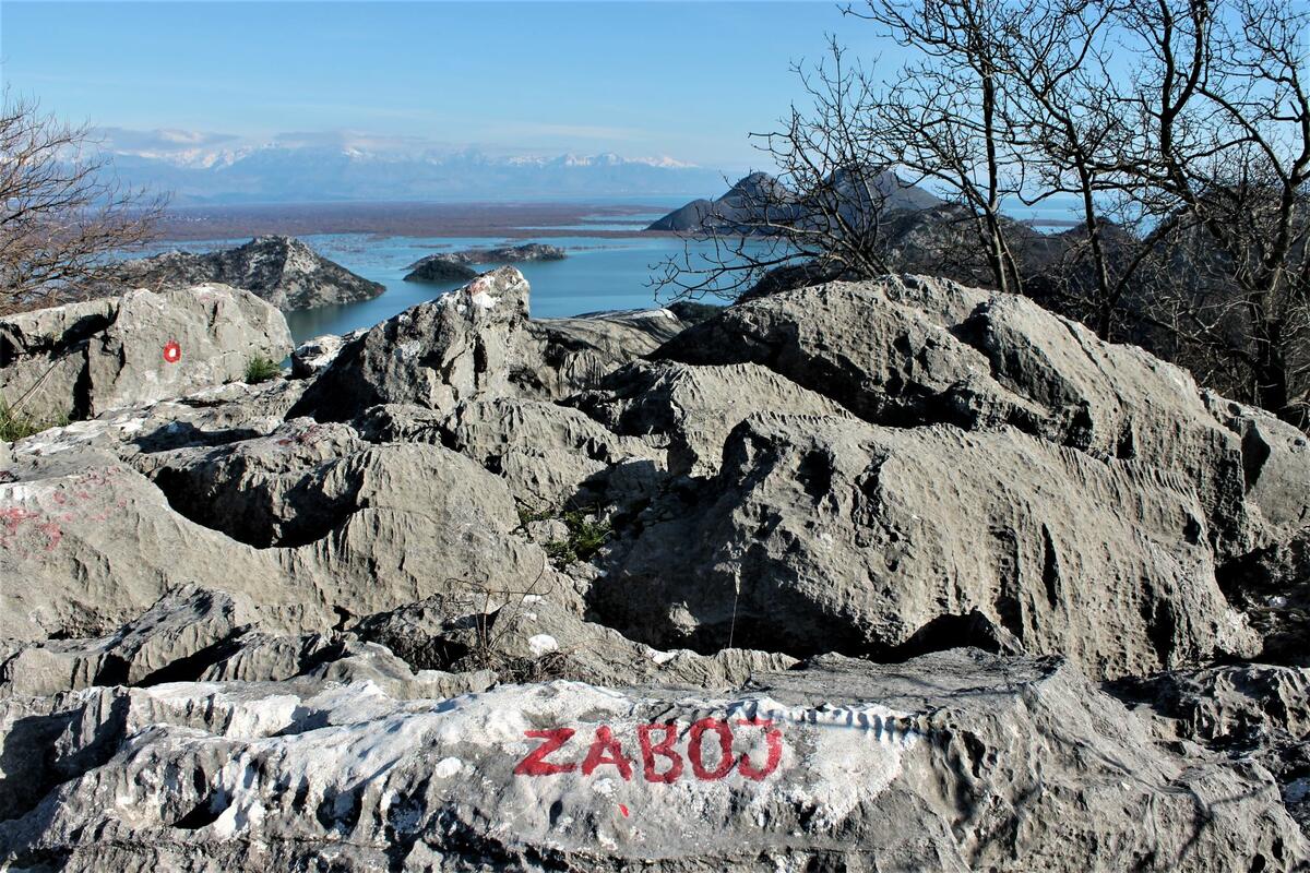 Tada više nije bilo dileme da smo na pravom putu. Konačno da jednom imamo sreće sa ne samo vedrim danom nego i bistrim vazduhom. Obilazili smo Skadarsko jezero i peli se na vidikovce oko njega nebrojeno puta. Zato nam je bilo lako i da otkrijemo šta sve vidimo oko sebe, a bilo je baš dosta toga. Vidjeli smo Malu i Veliku Bobiju i poluostrvo Prevlaku sa istoimenim selom naspram njih. U pozadini su se vidjele brojne planine prekrivene svijegom, no zanimljivije nam je bilo ono što nam je bilo bliže oku. Odmah ispod nas je mala uvala sa ribarskim selom Relja, a desno od njega Zaliv Gusjenica (do tad mi nepoznat) sa Vranjinom u pozadini. Ispred nas Žabljak Crnojevića, desno iza njega selo Ponari. Iznad njega novooznačena staza “Balšin grad” kojom planiram da prošetam. Ovaj pogled su uokvirivale albanske planine pod snijegom koje su mnogo doprinijele njegovoj ljepoti. Sve u svemu, gdje god da sam pogledala bile su to dobro poznate i drage mi lokacije koje mi nikad ne dosade. Jer, jezero nikad nije isto. Inače, ispostaviće se da se vidikovac Zaboj nalazi direktno ispod vrha Komarštik (Komaraštik) samo što se do Zaboja neuporedivo lakše stiže, a pogled skoro isti.