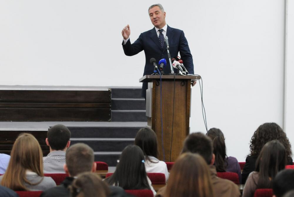 Lekciju o tome držao je Milo Đukanović, jedan od osnivača fakulteta, premijer, dugogodišnji političar, a u pauzama državničkog posla i biznismen, koga su srednjoškolci dočekali aplauzom.