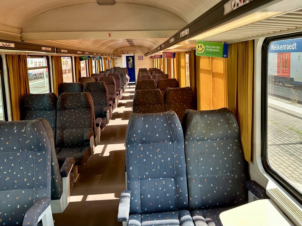 Pored modernih vagona, voz koji stiže ima i nekoliko muzejskih primjeraka. Ovdje još uvijek živi duh putovanja iz osamdesetih, kada su ovakva sjedišta kao u autobusu i zavjese na prozorima odisali modernošću. Za nas dvojicu je prazan vagon zapravo vremeplov.