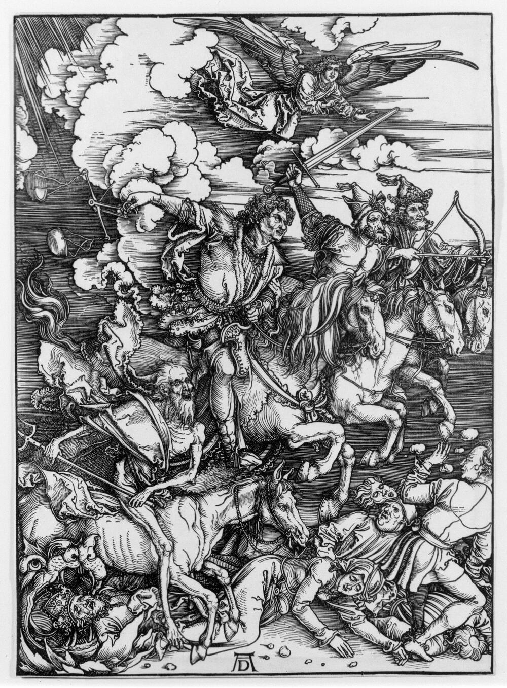 Bez sumnje najvredija i najpopularnija kompozicija ciklusa “Apokalipsa” je grafika “Četiri jahača Apokalipse”. U njoj su izražene sve značajke Direrovog grafičkog genija. U mnoštvu minucioznih detalja cjelina prizora zrači jedinstvenom energijom. Oni koji se studiozno bave Direrovom umjetnošću znaju se pitati, ne nalazeći tačan odgovor, zašto se umjetnik odlučio da ciklus “Apokalipsa” izradi u grafičkoj tehnici drvoreza a ne u slikama tehnikom ulja na platnu.