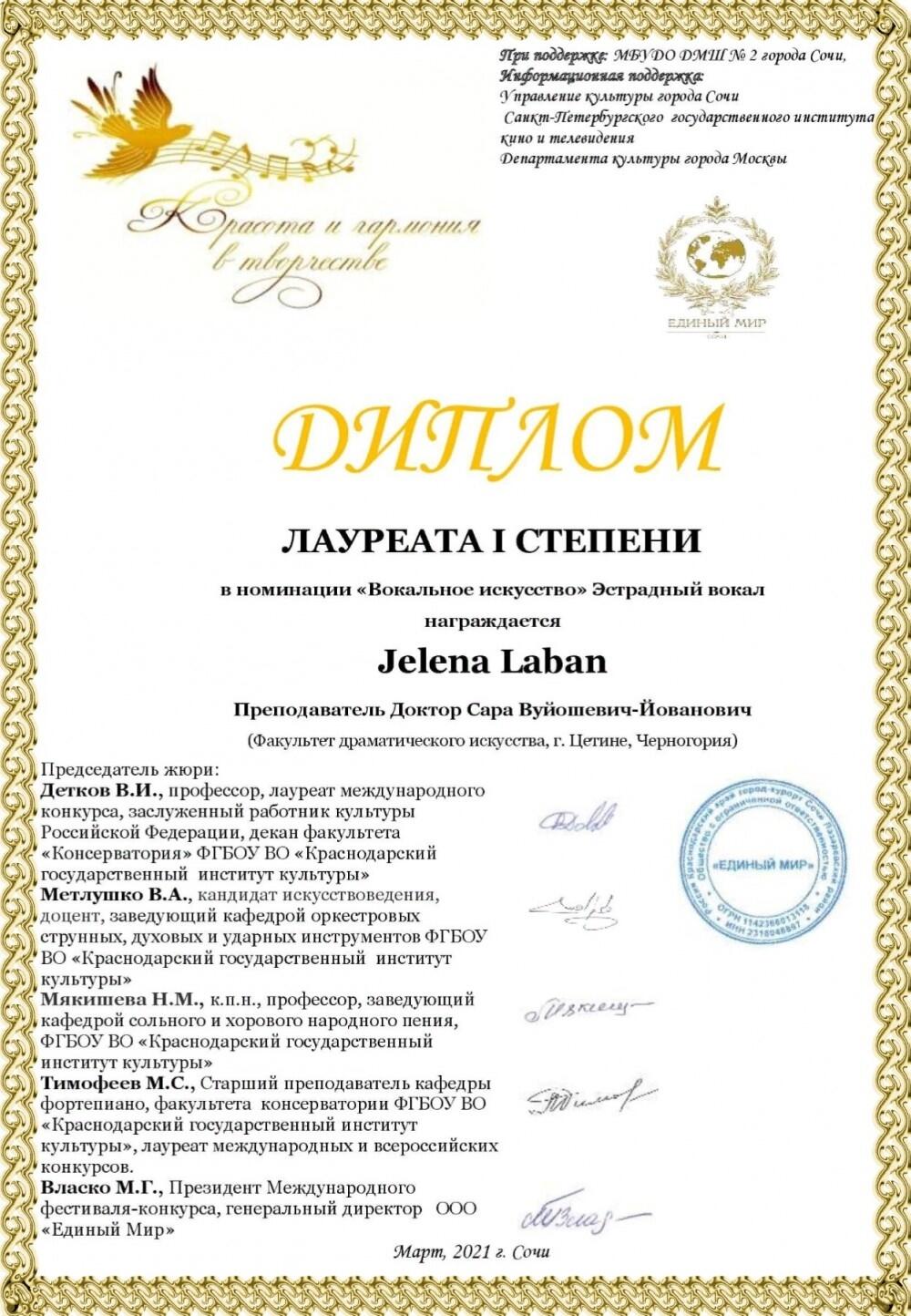 Mlada i uspješna crnogorska glumica Jelena Laban osvojila je prvu nagradu na šestom Međunarodnom muzičkom festivalu-takmičenju u Rusiji, u Sočiju.