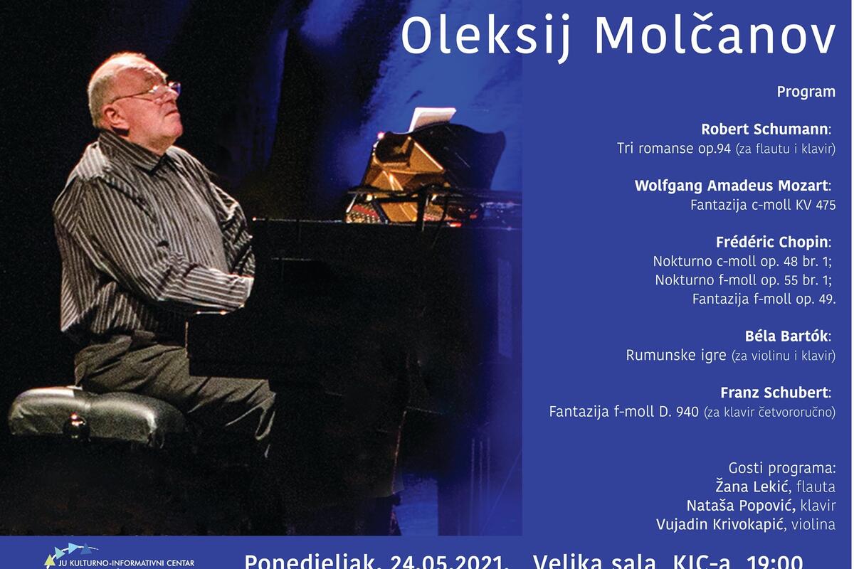 Koncert povodom 40 godina rada pijaniste i redovnog profesora korepeticije na Muzičkoj akademiji Univerziteta Crne Gore Oleksija Molčanova biće upriličen danas u Podgorici, u Kulturno-informativnom centru “Budo Tomović” u 19 časova.
