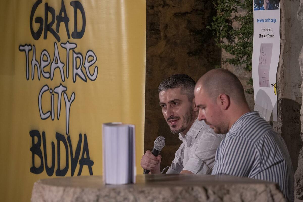 Književni program ovogodišnjeg festivala “Grad teatar” nastavljen je 3. avgusta, a gost Trga pjesnika bio je pisac Mirko Jovanović koji je predstavio svoj roman “Između crnih polja” što je ujedno i prva promocija ovog romana objavljenog 2020. godine.