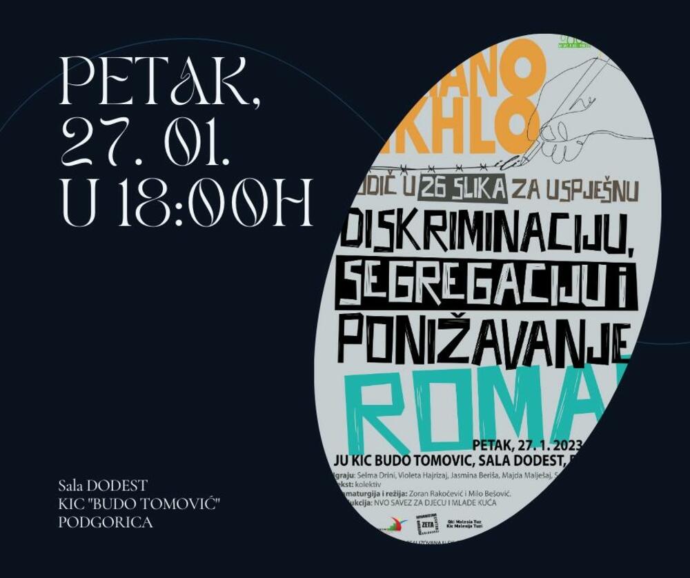 Pozorišna predstava “Romano Dikhlo”, ili kako je ranije najavljivana “Vodič u 26 slika za uspješnu diskriminaciju, segregaciju i ponižavanje Roma”, biće izvedena sjutra u Podgorici, u sali Dodest Kulturno-informativnog centra “Budo Tomović” u 18 časova.