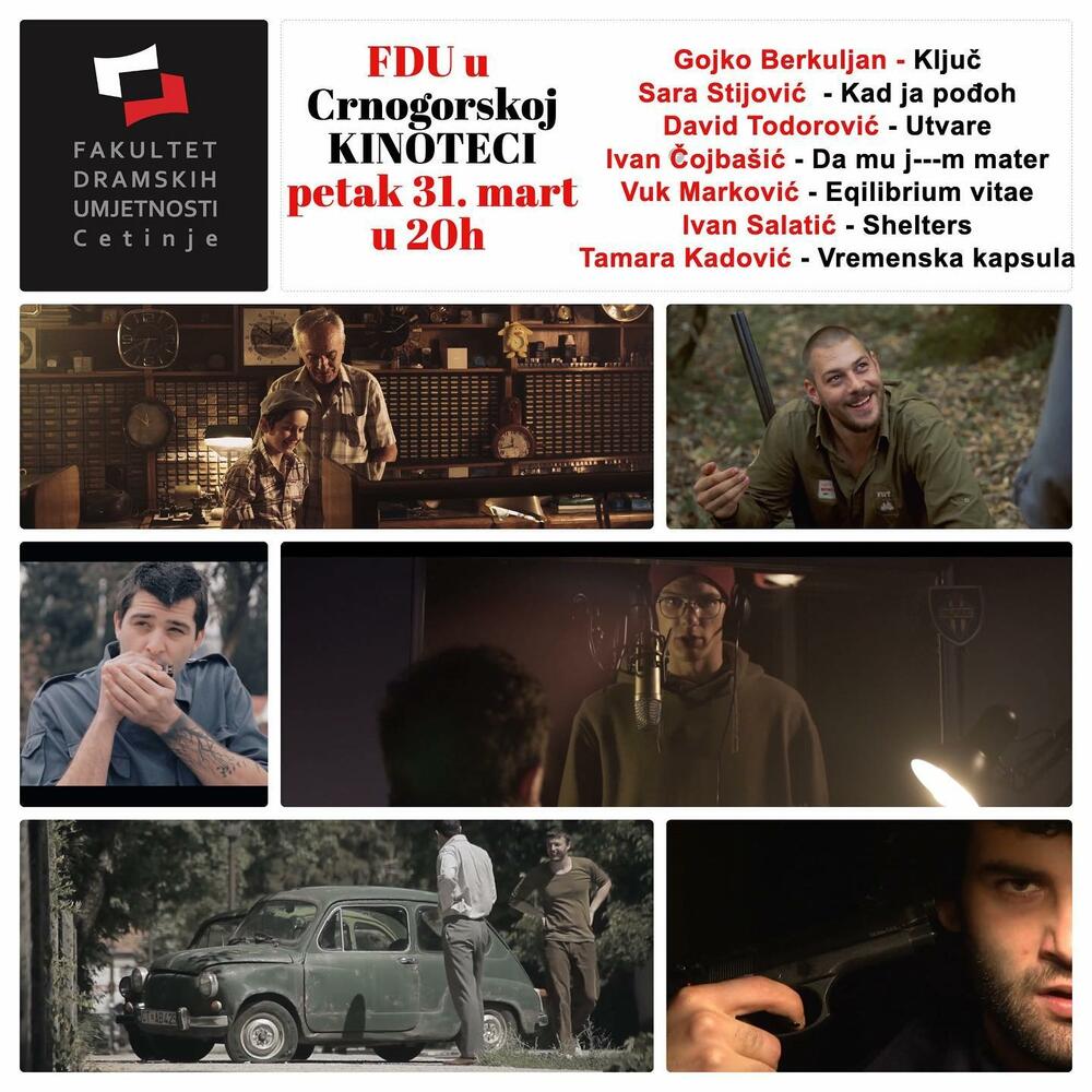 Večeras će biti prikazani filmovi: "Vremenska kapsula" Tamare Kadović, "Kad ja pođoh" Sare Stijović, "Utvare" Davida Todorovića, "Da mu j***m mater" Ivana Čojbašića, "Equilibrium vitae" Vuka Markovića, "Shelters" Ivana Salatića i "Ključ" Gojka Berkuljana.