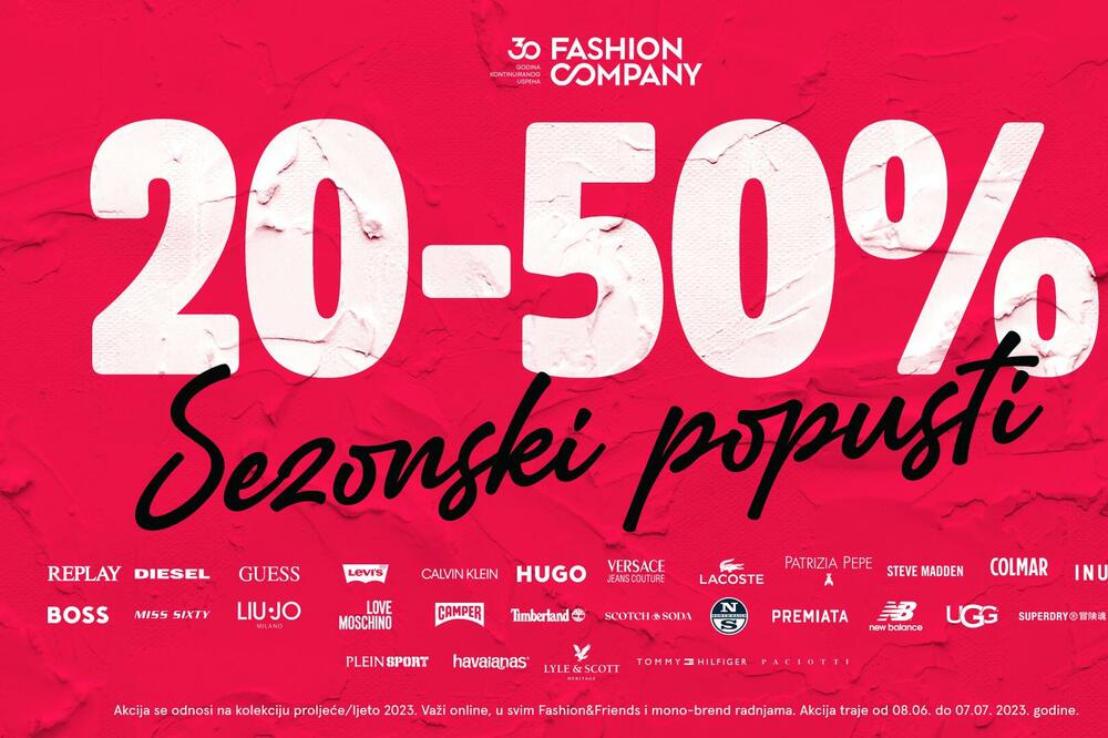 Kako bismo vas spremili za sunčanije dane, odabrali smo dvadeset efektnih komada za proljeće i ljeto koji se nalaze na velikom sniženju u prodavnicama Fashion Company i Fashion&Friends u Podgorici, Budvi, Baru, Kotoru i Nikšiću, kao i na Fashion&Friends onlajn šopu i mobilnoj aplikaciji.