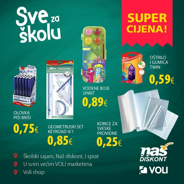 Osim u Podgorici, na prvom spratu Našeg diskonta, školski program možete pronaći i u svim većim VOLI marketima.