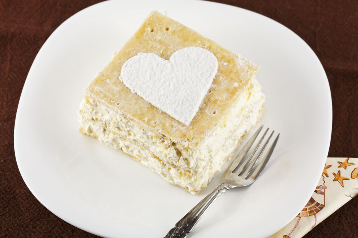 4. Skloniti gornju isječenu koru, sipati fil, pa vratiti gornju koru (parče po parče). Paziti da se parčad na gornjoj i donjoj kori poklapaju kako bi se lakše vadila (najlakše je filom na ivici pleha staviti tačkice i između njih slagati gornji red trouglića). Na kraju posuti prah šećerom.
