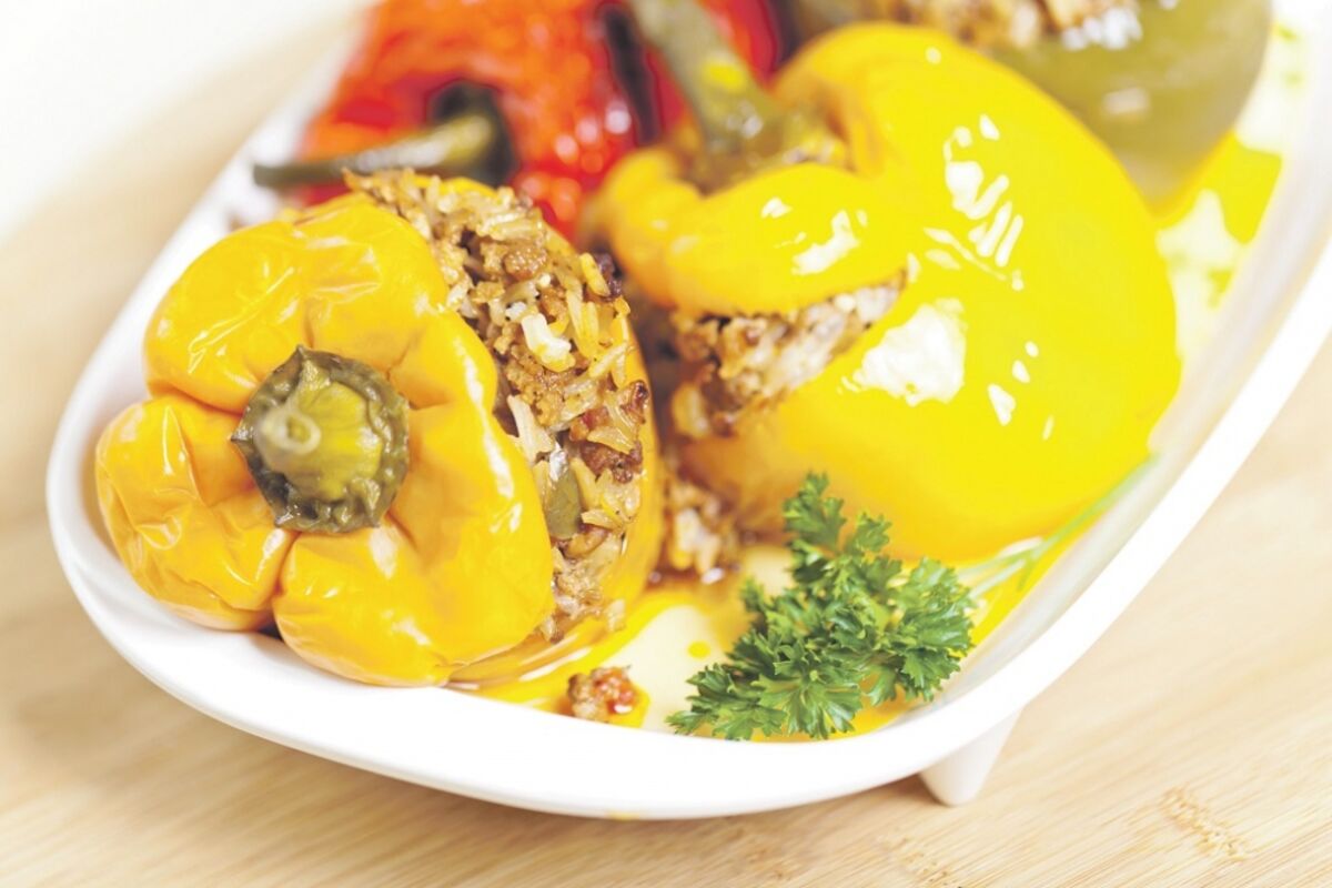 Sve dobro izmiješati i puniti paprike. Skuvati supu od povrća i u nju dodati pasirani paradajz. Izliti u vatrostalnu posudu i na to poslagati paprike.