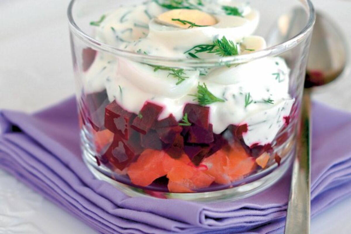 Na dno stavite losos ili tunjevinu, preko kockice cvekle, pa ih posolite i pobiberite.