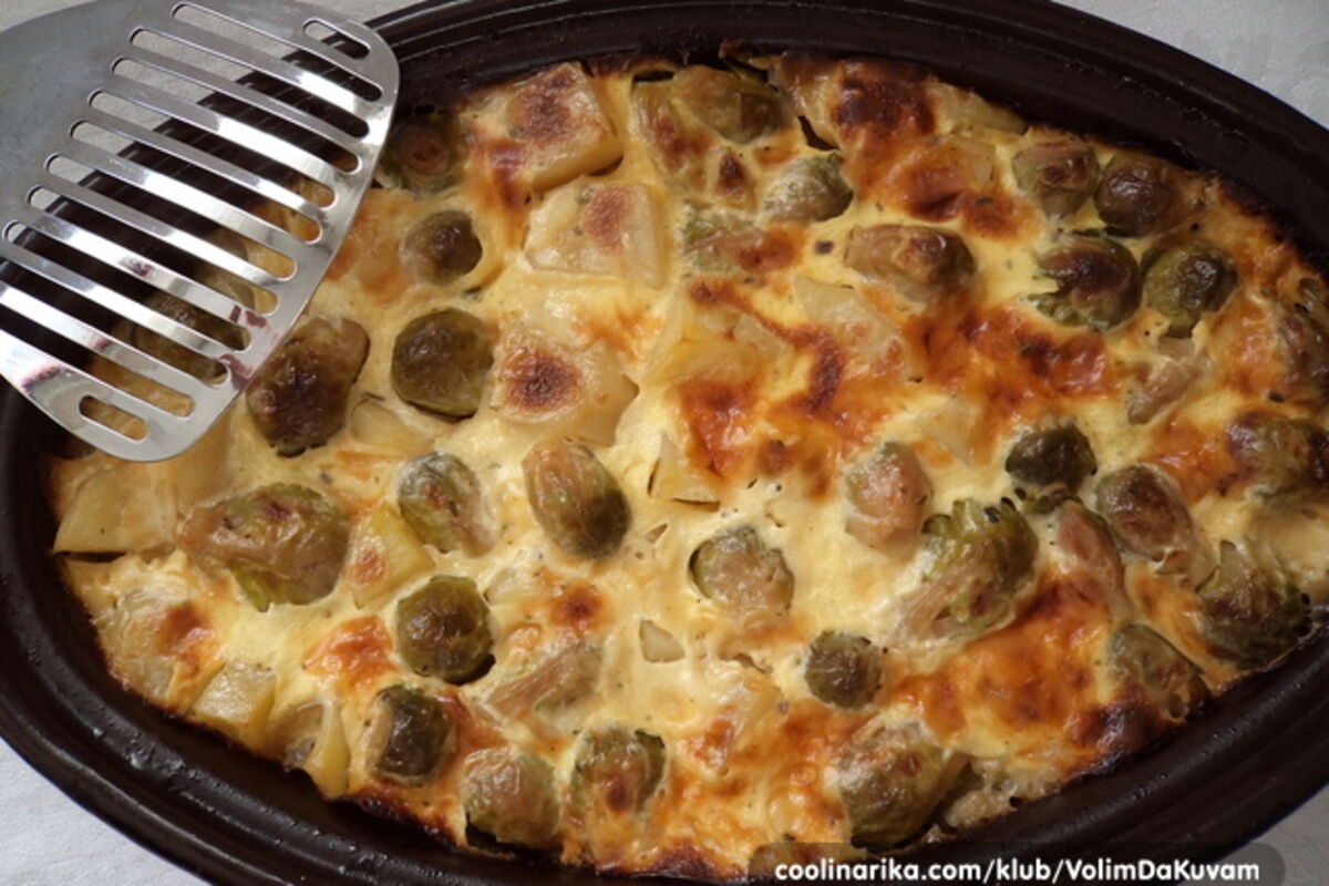Nakon sat vremena pečenja, preliti pripremljenim prelivom od jaja, začina, pavlake, mleka i kačkavalja. Vratiti u rernu, bez poklapanja, da se zapeče i porumeni, oko 20min.