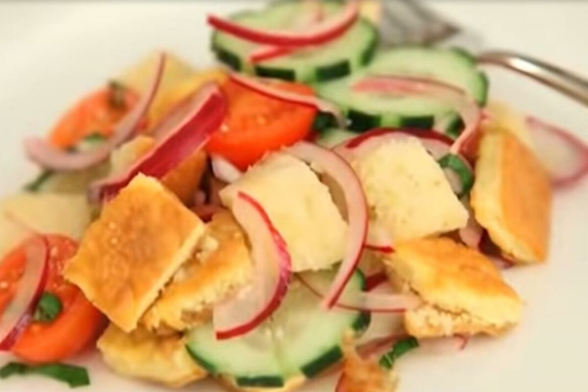 Mini paradajze prepolovimo, hljeb narežemo na kockice, krastavac na kolutove, luk na trakice, bosiljak nasjeckamo, sir narendamp, a jaja razbijemo u zdjelu i umutimo ih.