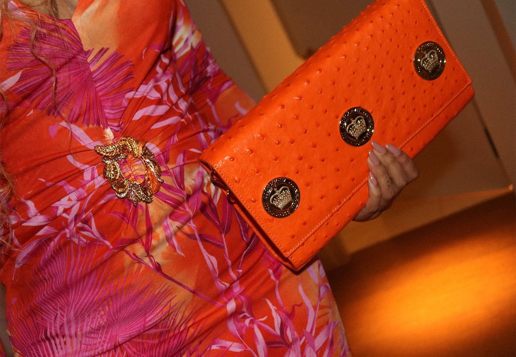 Uz svijetlo narandžastu i ružičastu haljinu sa tropskim printom nosila je zlatni broš na struku, kao i odgovarajuće čarape sa uzorkom.