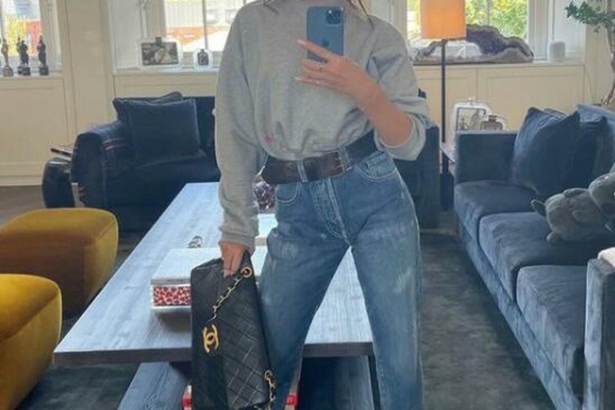 Ova svakodnevna ali i elegantna kombinacija, zaokružena je aksesoarima u vidu kožnog crnog kaiša i proštepane Chanel tašne u istoj neutralnoj nijansi. Duks je upasan poput košulje, a nogavice podvrnute tako da otkrivaju članke, koji su u ovom slučaju vrlo upadljivi, zahvaljujući crvenim potpeticama sa jednim tankim kaišićem oko zgloba.