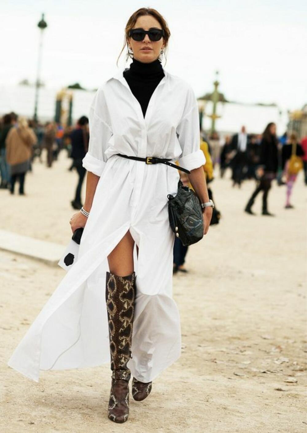 Ko ne voli da nosi sjajnu košulja-haljinu tokom čitave godine? Da biste izbjegli da hladno vreme loše utiče na vas jer nosite laganu haljinu, dodajte rolku i hulahopke i sve upotpunite parom čizama sa potpeticom.