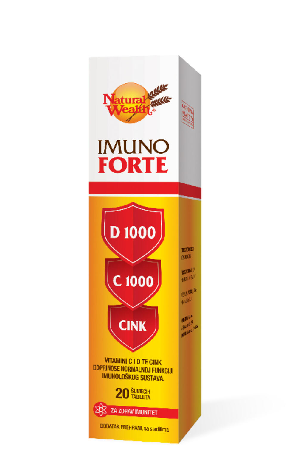 Još jedna od „zlatnih“ imuno suplemenata iz porodice Natural Wealtha jeste Imuno Forte. Moćna kombinacija vitamina C, vitamina D i cinka u formi efervesceta (šumećih tableta) doprinosi poboljšanju i očuvanju imunog statusa posebno u ovom prelaznom jesenjem periodu kao priprema organizma za zimu. Vitamin D je naročito u hladnijem periodu neophodan za normalnu imunološku funkciju organizma, a njegova uloga u očuvanju zdravih kostiju i zuba je odavno poznata. Doza vitamina D od 1000 i.j. u ovom proizvodu je dovoljna za odgovor na izazove za naš imunitet
