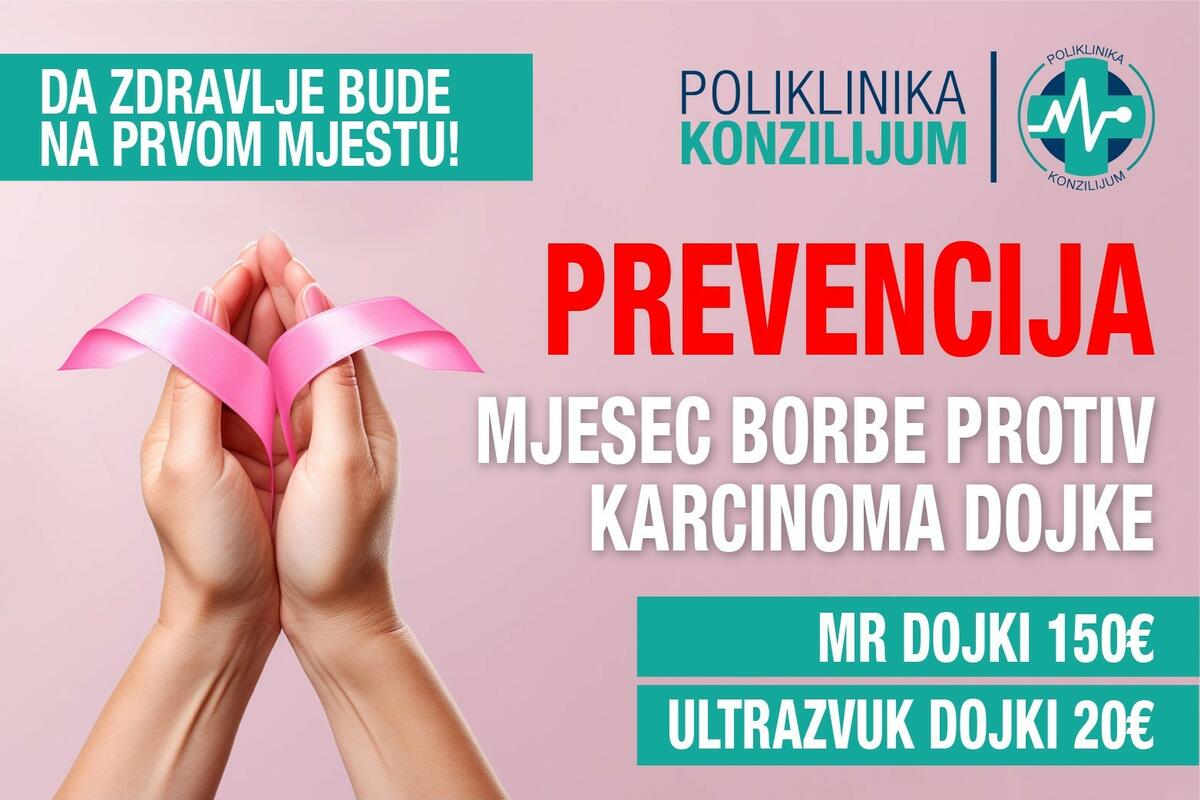 Ponekad nam je potrebna “blic provjera” , kontrola organizma I adekvatno praćenje određenog stanja, pa u namjeri da ne čekamo signal koji nam organizam šalje, Poliklinika Konzilijum je danas obezbijedila besplatne ultrazvučne preglede dojki za sve žene I pripremila posebne uslove za dalju dijagnostiku na magnetnoj rezonanci. U OKTOBRU-MJESECU BORBE PROTIV KARCINOMA DOJKE, pored osiguranika Fonda za zdravstveno osiguranje koji preglede na magnetnoj rezonanci mogu obavljati besplatno, pripremili smo posebne pogodnosti za sve žene koje žele uraditi magnetnu rezonancu dojki sa kontrastom po cijeni od 150€ ili ultrazvučni pregled dojki po cijeni od 20€ .