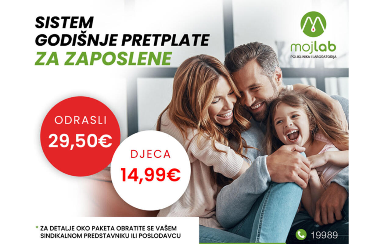 Zahvaljujući sistemima pretplate za zaposlene, za mjesečni iznos već od 14,99e za djecu i već od 29,50e za odrasle, imate mogućnost da o vašem zdravlju brinu stručnjaci poliklinike i laboratorije Moj Lab, koja je prisutna u 9 gradova.