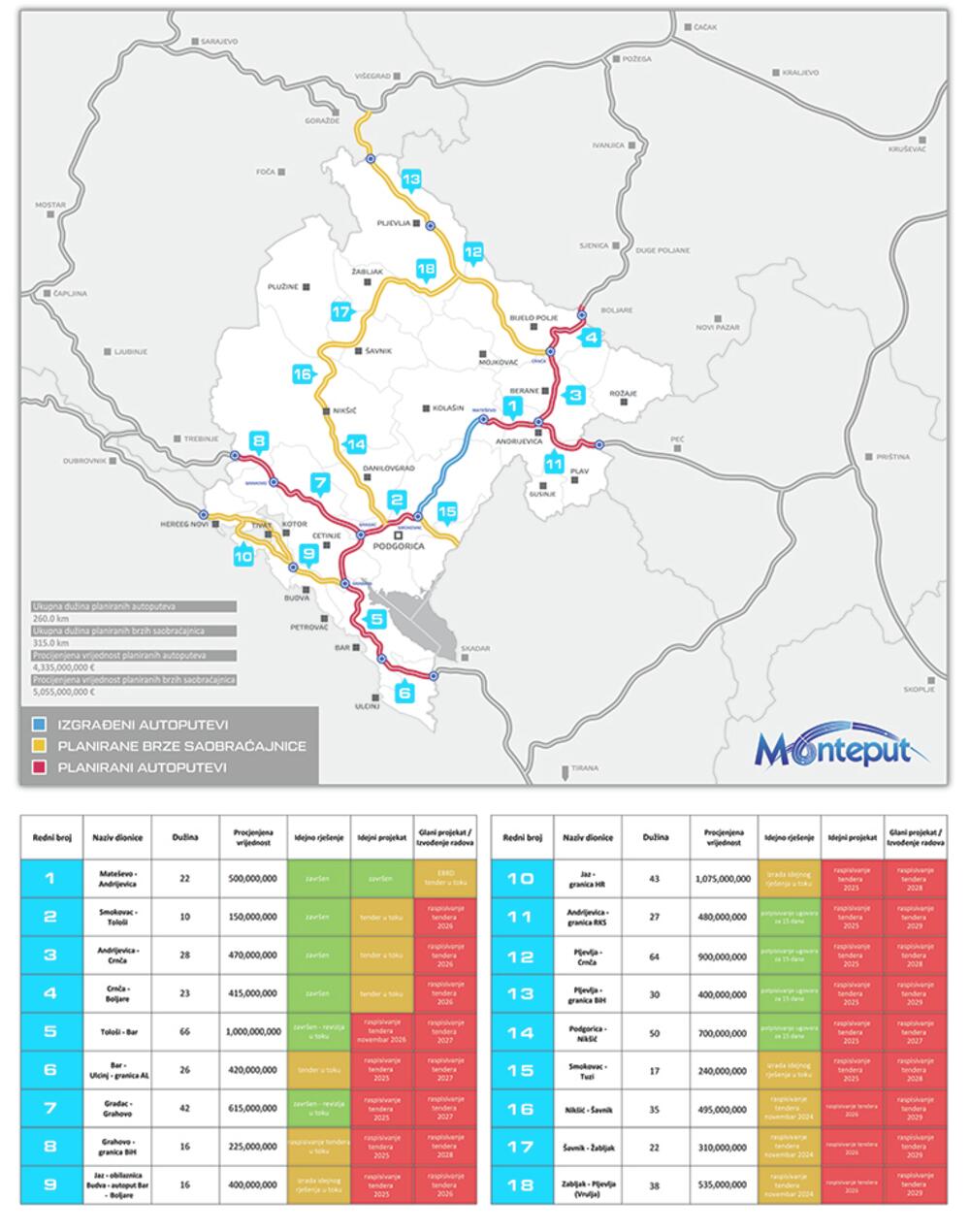 Takođe, objavljeni su i tenderi za izradu idejnih rješenja, a za većinu od njih i potpisani ugovori sa izvršiocima usluga, poput planiranog ukrštanja autoputa Bar – Boljare sa Jadransko-jonskim auto-putem i brzom saobraćajnicom; prelaza preko Bokokotorskog zaliva; izrada idejnih rješenja brze saobraćajnice Podgorica – Tuzi (Božaj); brze saobraćajnice Danilovgrad – Nikšić; te za dio Jadransko-jonskog autoputa Sozina –granica sa Albanijom; kao i izrada idejnog rješenja Jadransko-jonskog autoputa, dionica Čevo – granica s Bosnom i Hercegovinom, čime su obuhvaćeni svi neophodni koraci ka efikasnijem povezivanju primorskih i sjevernih oblasti.