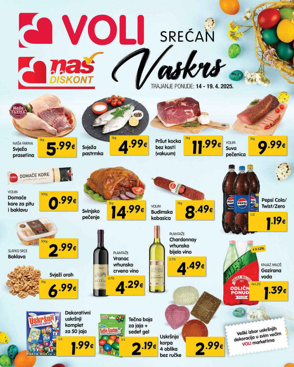 Iskoristite period od 14. do 19. aprila i kupite suhomesnate proizvode, piće, dezerte, kao i vaskršnju dekoraciju po povoljnim cijenama. Ponuda važi za sve Voli markete.