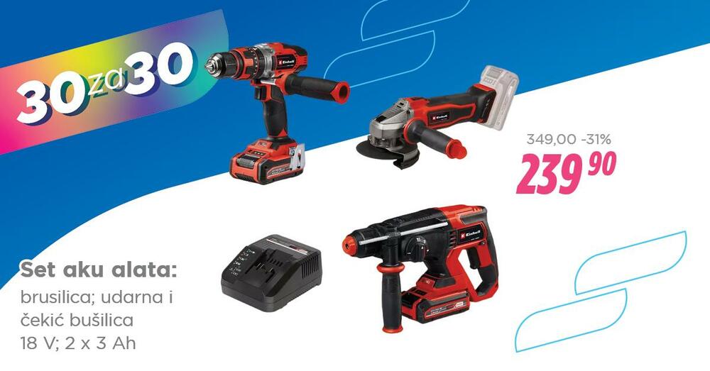 Set akumulatorskog alata Einhell: Bušilica, brusilica i čekić bušilica dostupni za 239,90 eura (31% popusta).