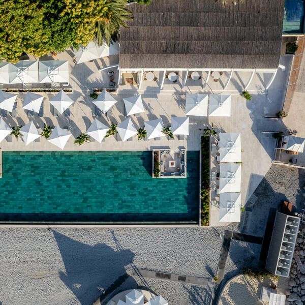 - Kaskadne terase bara koje se pitomo spuštaju ka dečjem i velikom bazenu, pružajući neprekinut pogled na more;