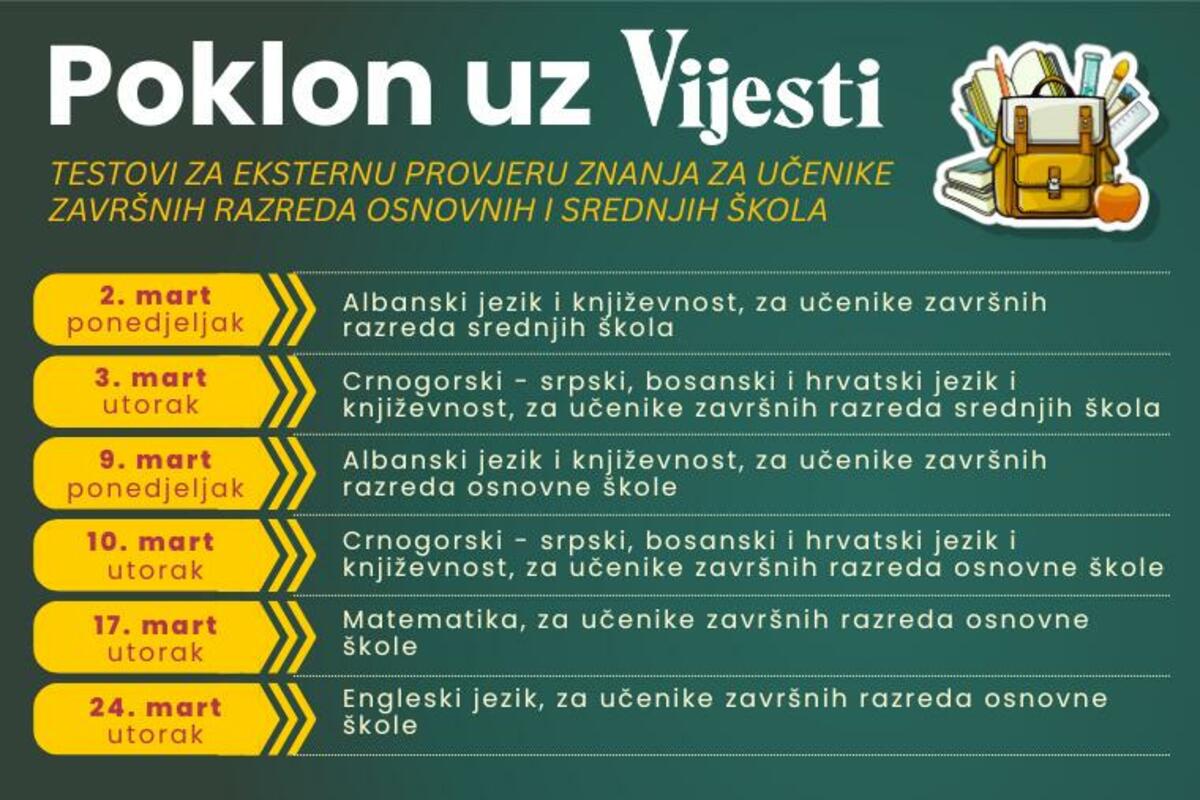 U nastavku su datumi kada ćemo dijeliti besplatno testove za eksternu provjeru znanja uz štampano izdanje Vijesti:
